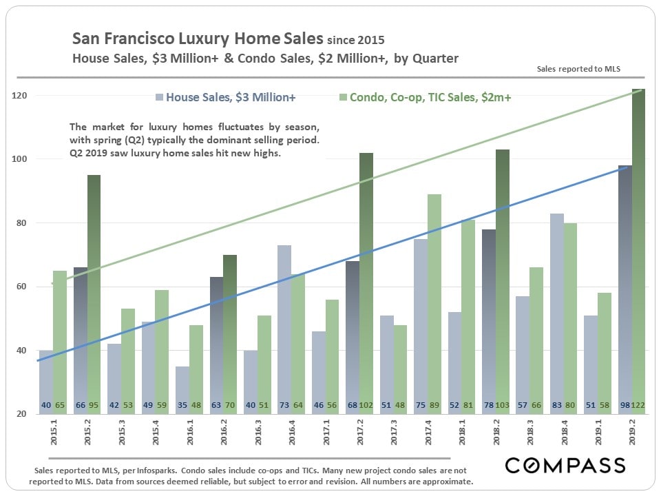 The first chart below breaks out luxury homes as defined by houses selling for $3m and above, and condos, co-ops and TICs selling for $2m or more.