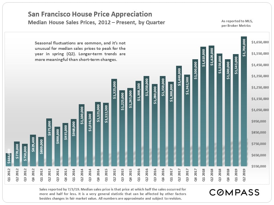 The median house sales price hit $1,700,000 — $80,000 above the previous peak for the same period in 2018. For condos, the new quarterly median price hit $1,250,00 — slightly above last year's $1,235,000.
