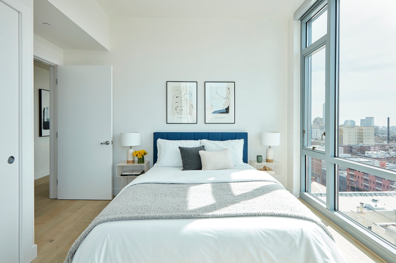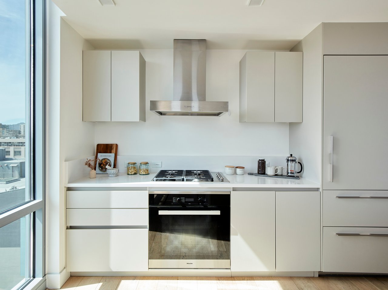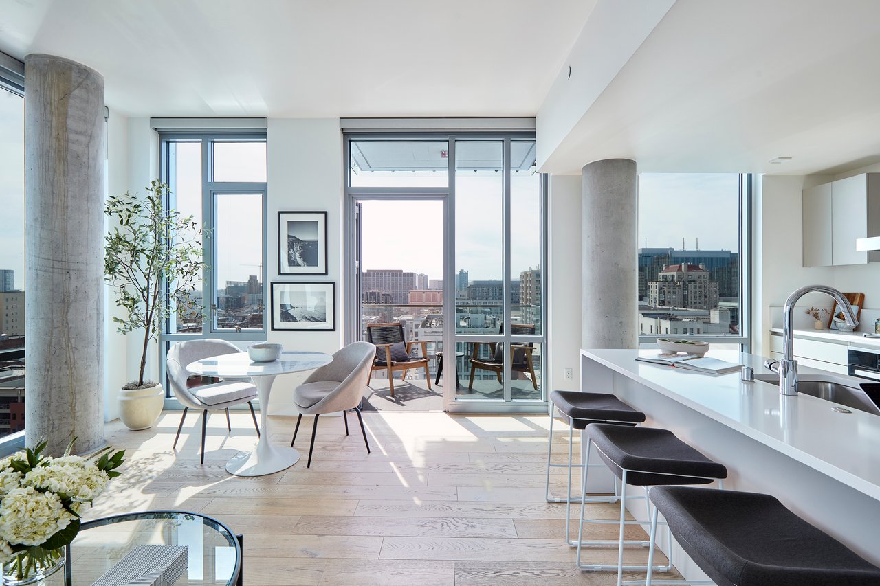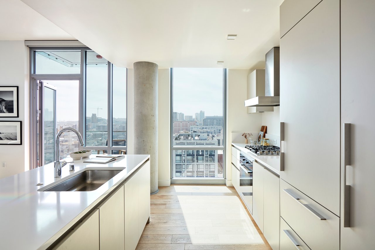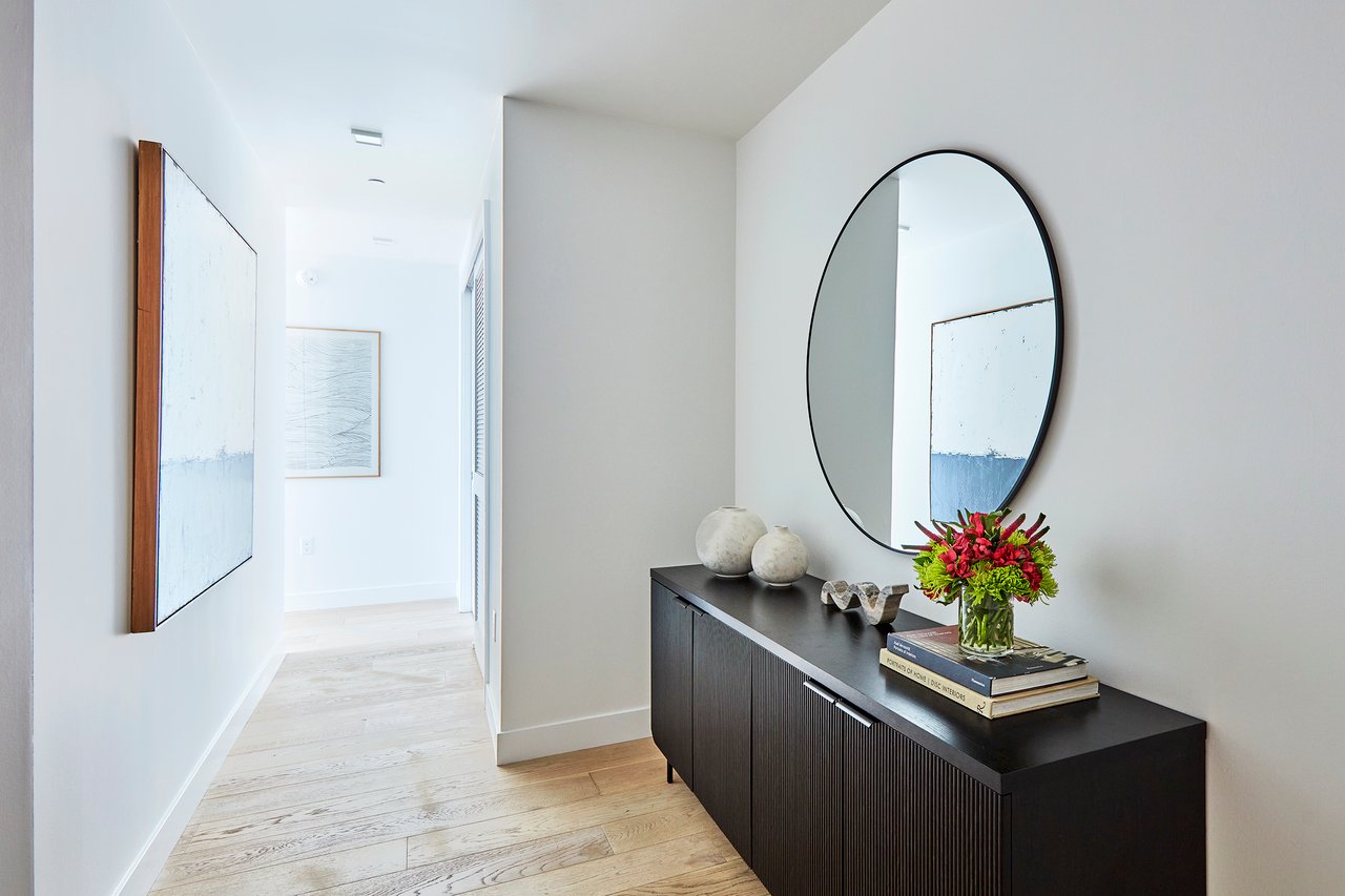Inside, refined finishes and thoughtful design details abound: wide-plank floors, central air-conditioning, and an abundance of storage with spacious walk-in closets, coat closets, and a full-height pantry. The sleek kitchen is outfitted with premium Miele and Bosch appliances, complemented by an oversized island with counter seating. Built in 2016, this modern residence offers the convenience of in-unit laundry, one dedicated parking space in a secured underground garage, and bike storage.
