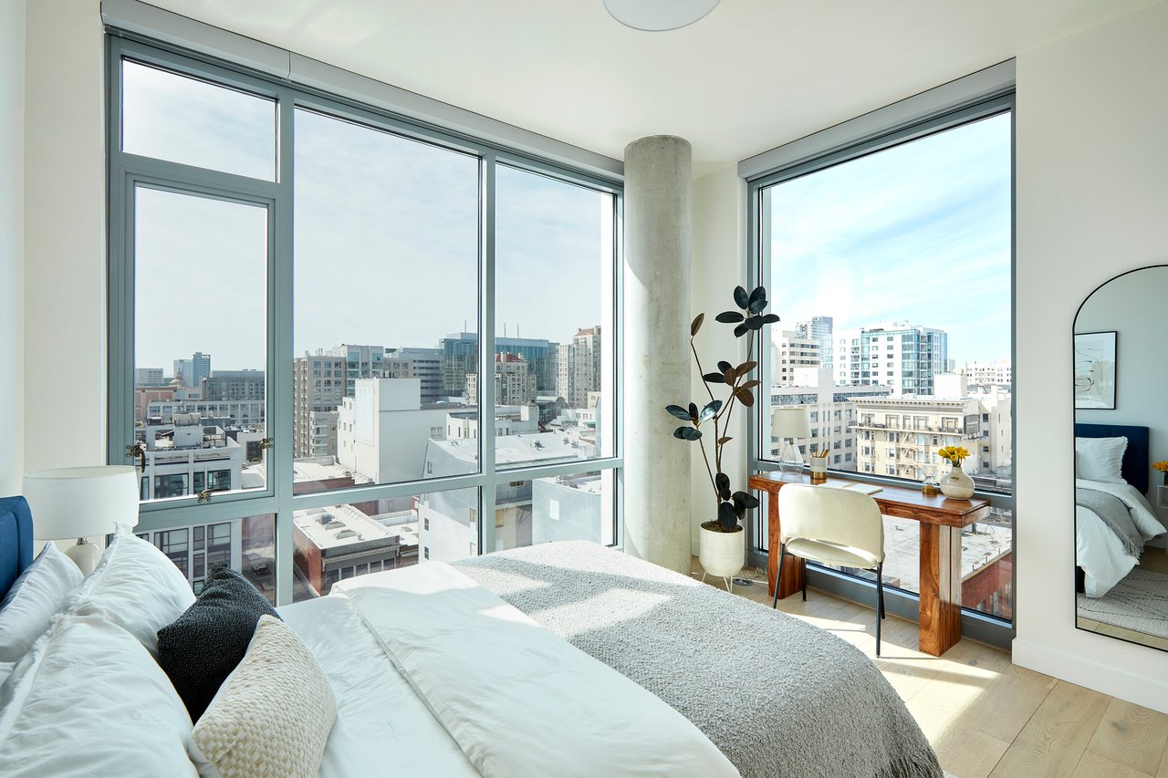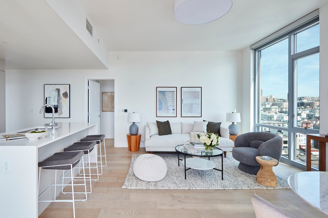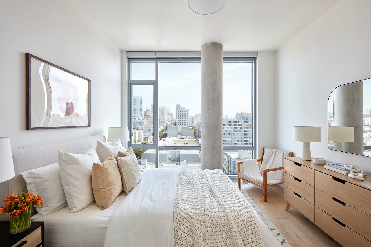 Welcome to 1545 Pine Street #1104. Situated on the 11th floor, this luminous two-bedroom, two-bath corner residence at The Austin captures the essence of elevated San Francisco living. Floor-to-ceiling windows bathe the home in natural light, framing breathtaking, unobstructed panoramic views that stretch from Russian Hill to Twin Peaks. With some of the highest ceilings in the building, the sense of volume and openness is truly exceptional. A private glass-railing balcony extends your living space outward perfect for a morning coffee or intimate breakfast above the city.